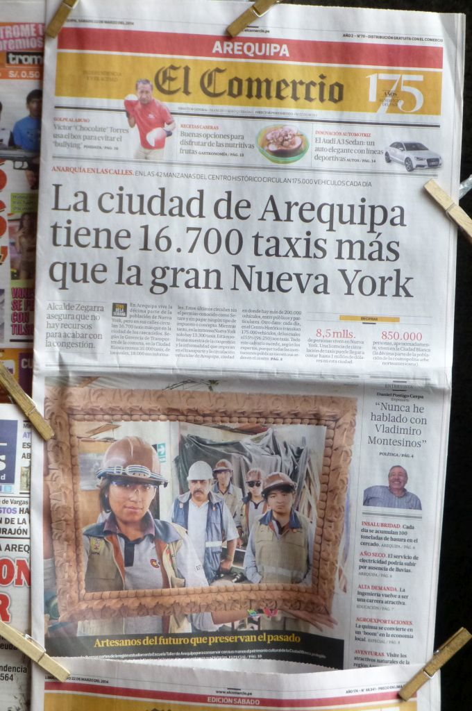 Fast gleichzeitig fuhren (25. März) spätabends zwei Busse von Cusco weg nach Puno. Die direkte Strecke war nicht benutzbar, wegen Streiks von Minenarbeitern, Strassenblockaden und wahrscheinlich Polizeieinsätzen. Schon in Cusco war augenfällig, wie viele Polizei herumstand, alle in rabenschwarzen Kampfmonturen, Kugelwesten, Maschinenpistolen und Tränengasgewehren, und viele, teilweise gepanzerte Fahrzeuge standen in den Strassen. Um was es ging, erfuhr ich an den vielen Zeitungsständen. Dort versammelten sich zahlreiche Menschen, welche die neu eingetroffenen Schlagzeilen der ausgehängten Zeitungen lasen.