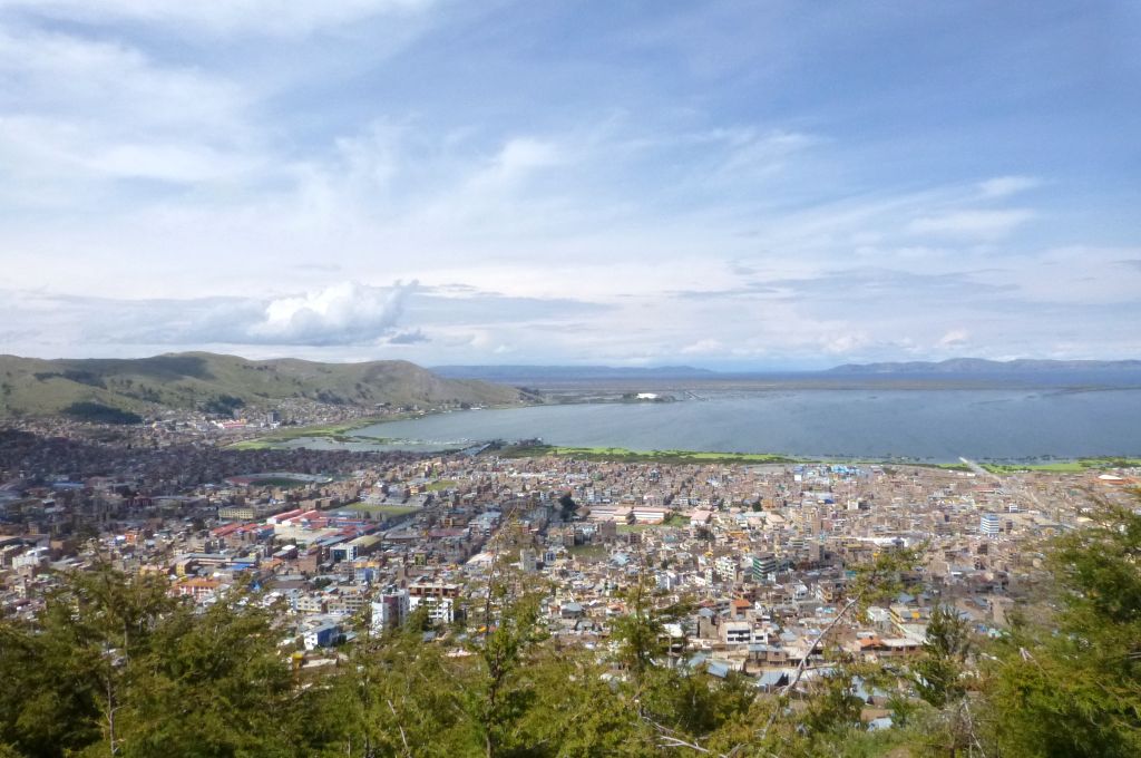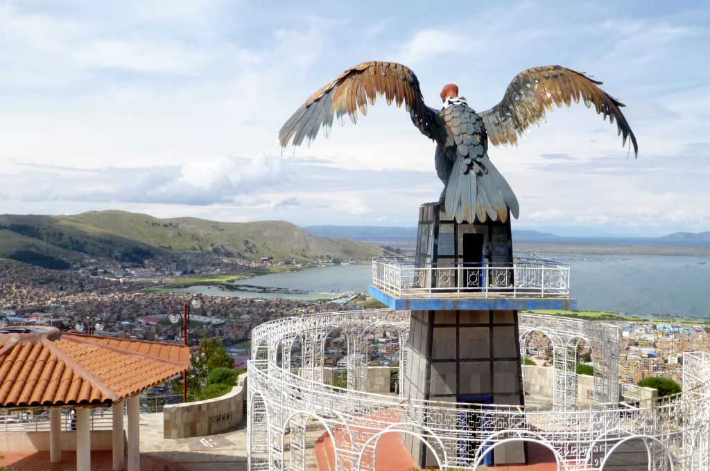 Puno (100’000 Einwohner) ist steil an die Hänge der eine Bucht umgebenden Berge gebaut. Eine Stadt für Fitte, kann man sagen! Mein Hotel lag schon weit oben. Und um auf den Cerro Huaisapata mit diesem riesigen Kondor, der über Puno wacht, zu kommen, musste ich sage und schreibe 800 Treppenstufen nehmen (habe gezählt).